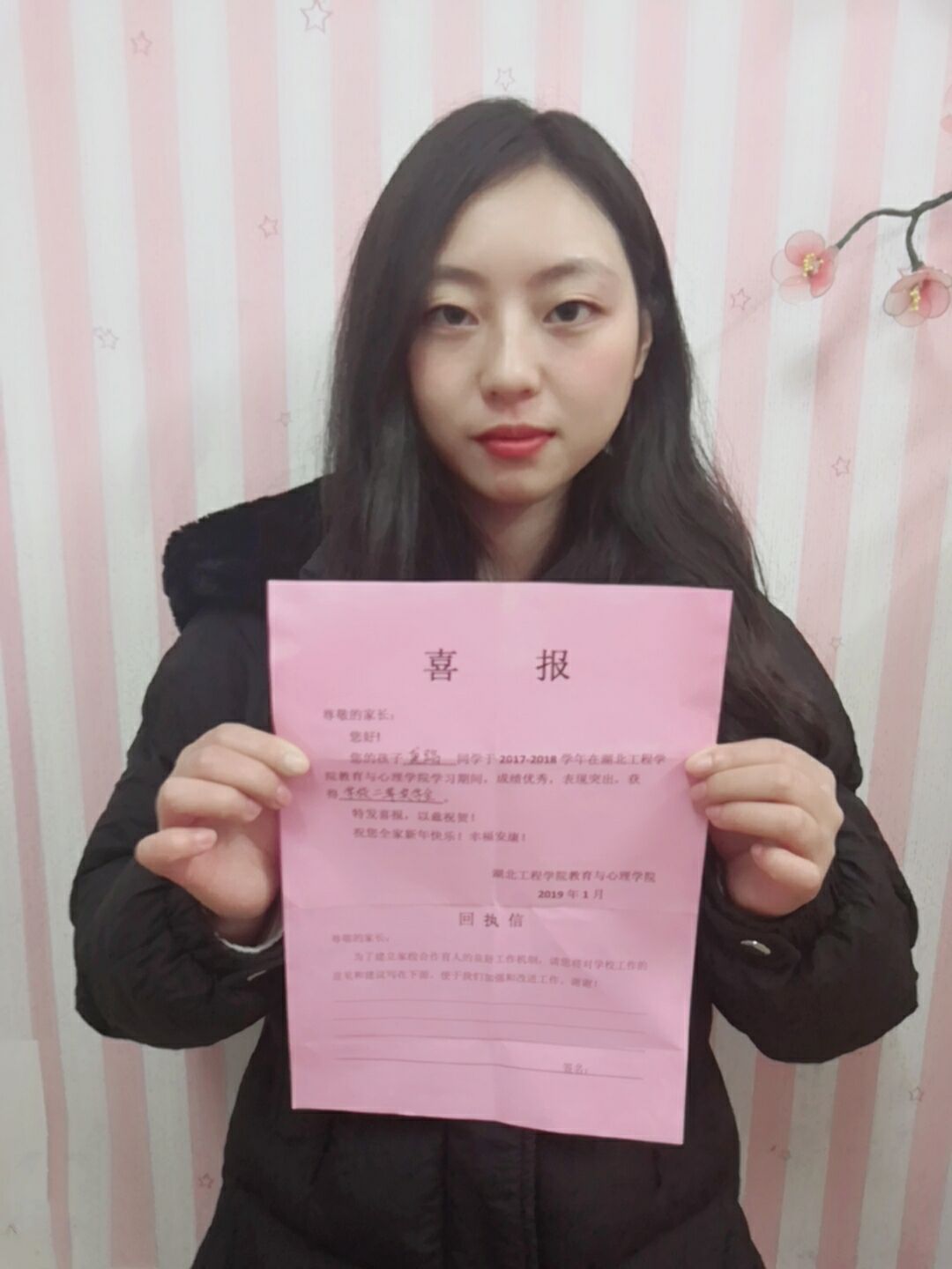 2019年1月,威廉体育williamhill员工会勤工部进行“送喜报,传温情”工作。为表彰威廉体育williamhill2018年获得国家奖学金、国家励志奖学金、公司奖学金的同学们,并与获奖同学的家长们分享这份喜悦,促进公司与家长之间的交流,公司给本院获奖的76名同学的家长寄去喜报。