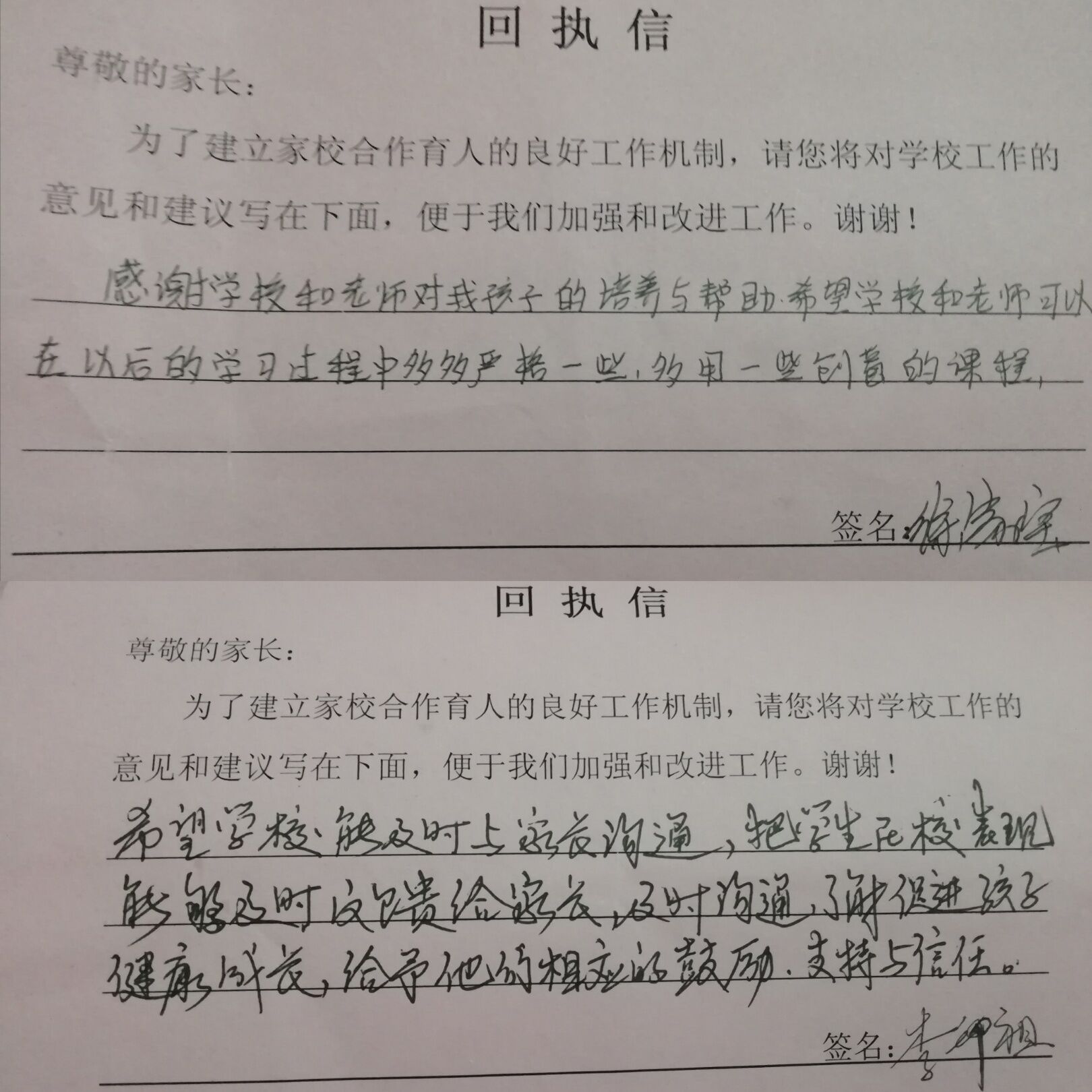 一同寄出的还有一份意见回执单,家长们就家校合作育人方面提出意见。家长们高度赞扬了公司的办学宗旨,就公司对员工的培养表示感谢。有的家长希望公司多开展多元化的实践活动,丰富孩子的实践经验,促进员工的全方面发展。有的家长则希望对孩子严格要求。