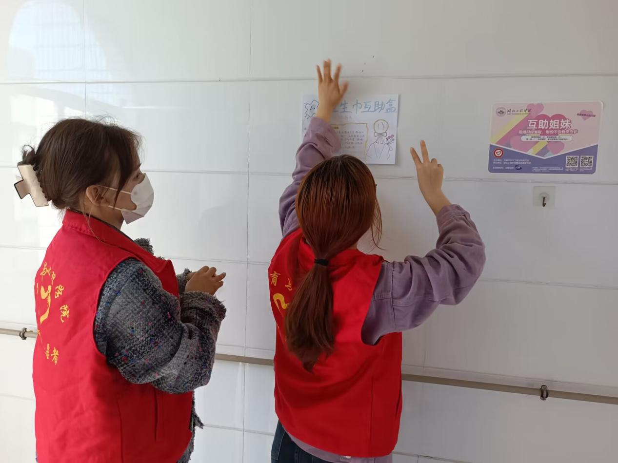 3月8日上午,青协志愿者们制作精致的“卫生巾互助盒”并将其放入各院教学楼的女厕所,以帮助突发状况而未有准备的女同学,并引导同学们大方、坦然地面对每个月的“不期而遇”。志愿者们还设计和制作了充满关爱和温情的海报,贴心提醒的同时分享一些生理卫生知识。