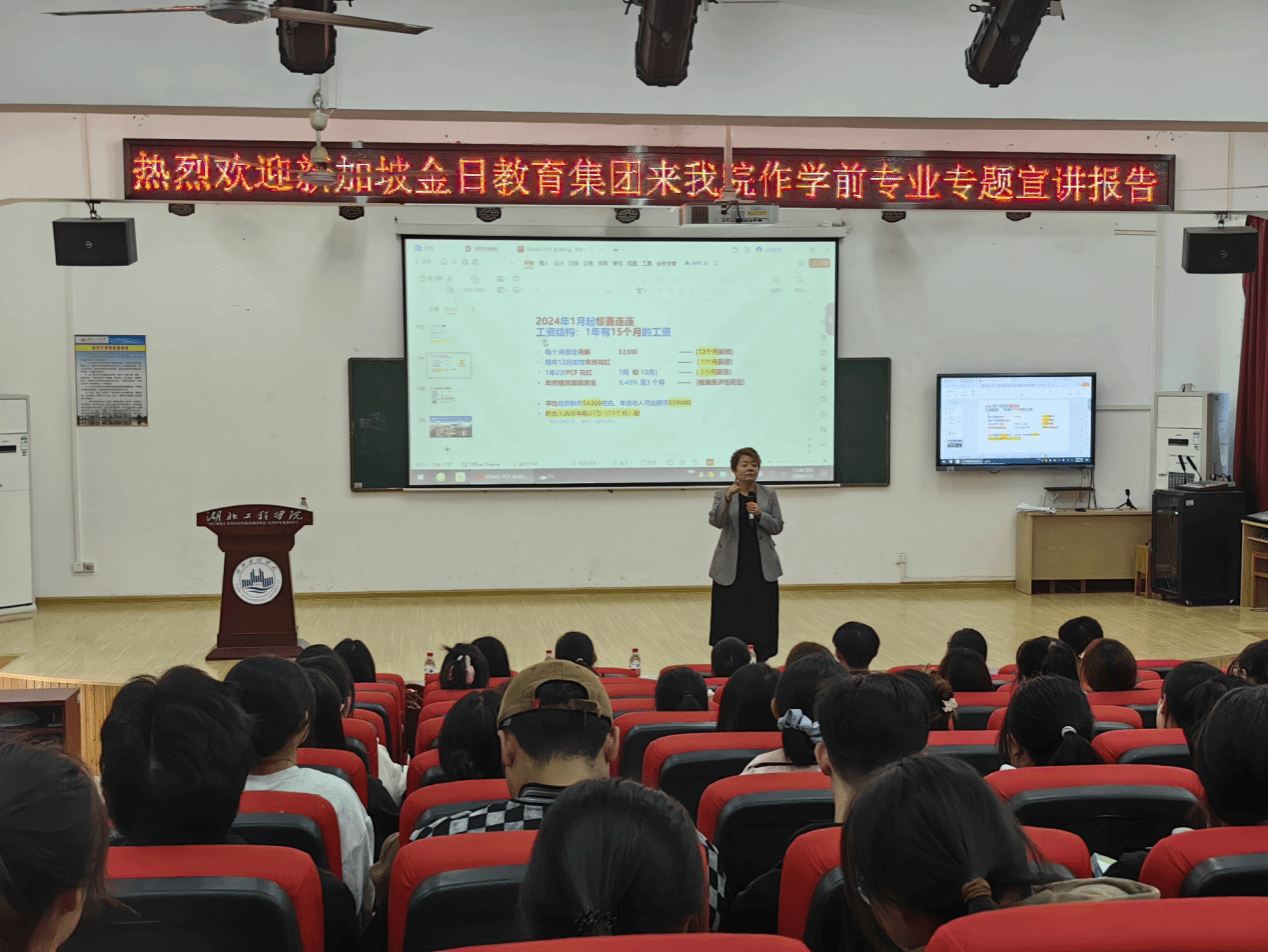 2024年11月1日下午两点半教育楼108,新加坡金日教育集团孙老师为公司学前教育专业在开展专业宣讲会。本次宣讲会22级全体学前教育员工、21级在校学前教育员工参加,由党委副书记于飞飞老师、公司辅导员彭佳慧老师共同主持。
